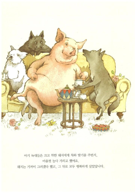 [주요 소재의 반복] <아기 늑대 세 마리와 못된 돼지>는 아기 돼지 삼형제 이야기를 연상케하지요. 돼지와 늑대에 대한 고정관념 전환이 무척 인상적인 책입니다. 이 책의 면지는 앞뒤 동일하게 찻주전자와 찻잔으로 반복되고 있어요. 이게 무언가, 궁금해지게 되지요. 이야기 속에서 차는 꽤 중요한 소재로 등장합니다. 돼지가 문을 열어달라고 할 때마다 아기 늑대들은 "우리 집에서 차 마시는 건 꿈도 꾸지마!"라고 외치지요. 이들에게 차는 단순히 음료가 아니라 함께 시공간을 공유하고 대화를 나눌 수 있는 중요한 매개입니다. 그래서 돼지의 공격을 피해 늑대들이 도망다닐 때마다 이 찻주전자와 찻잔을 고이 싸들고 다녀요. 마지막 장면에서 돼지를 집으로 초대해 차를 대접하는 것이야말로, 돼지와 늑대들 간의 관계 전환을 직접적으로 보여주는 것이라 할 수 있습니다. 따라서 이 책에서 '차'는 돼지의 변화를 이끌어내는 '꽃'만큼이나 중요한 소재입니다. 그리고 그림 작가는 면지에서부터 그 중요성을 부각시켜줍니다.