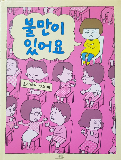 [등장인물의 관계 변화] 요시타케 신스케의 <이유가 있어요>, <불만이 있어요>는 아주 유머러스한 책입니다. 하지만 읽다 보면 아이들의 시각을 인정하고 존중하는 것이 중요하다는 생각이 들며, 읽어주는 부모를 뜨끔하게 만들지요. <불만이 있어요>의 경우 앞면지에는 늘 짜증내고 지시하고 거부하는 아빠가, 뒷면지에는 아이와 함께 시간을 보내는 행복한 아빠가 그려져 있습니다. 본문의 대화를 통해 아빠와 아이가 서로를 조금씩 이해하고 가까워지게 되는데요, 이 때 변화되는 부녀 관계를 면지에 담고 있는 것입니다. 재미있는 것은 책날개 역시 서사의 일부를 담당하고 있습니다. 앞날개에는 자고 있는 아빠를 불만스럽게 바라보고 있는 아이, 뒷날개에는 '우리 아빠 대머리가 되지 않게 해주세요'라는 아이의 소원을 들은 아빠가 걱정스럽게 머리를 바라보고 있는 모습이 그려집니다. 본문에서 일어났던 사건의 전후까지 빠짐없이 보여주는 섬세함이 돋보입니다.