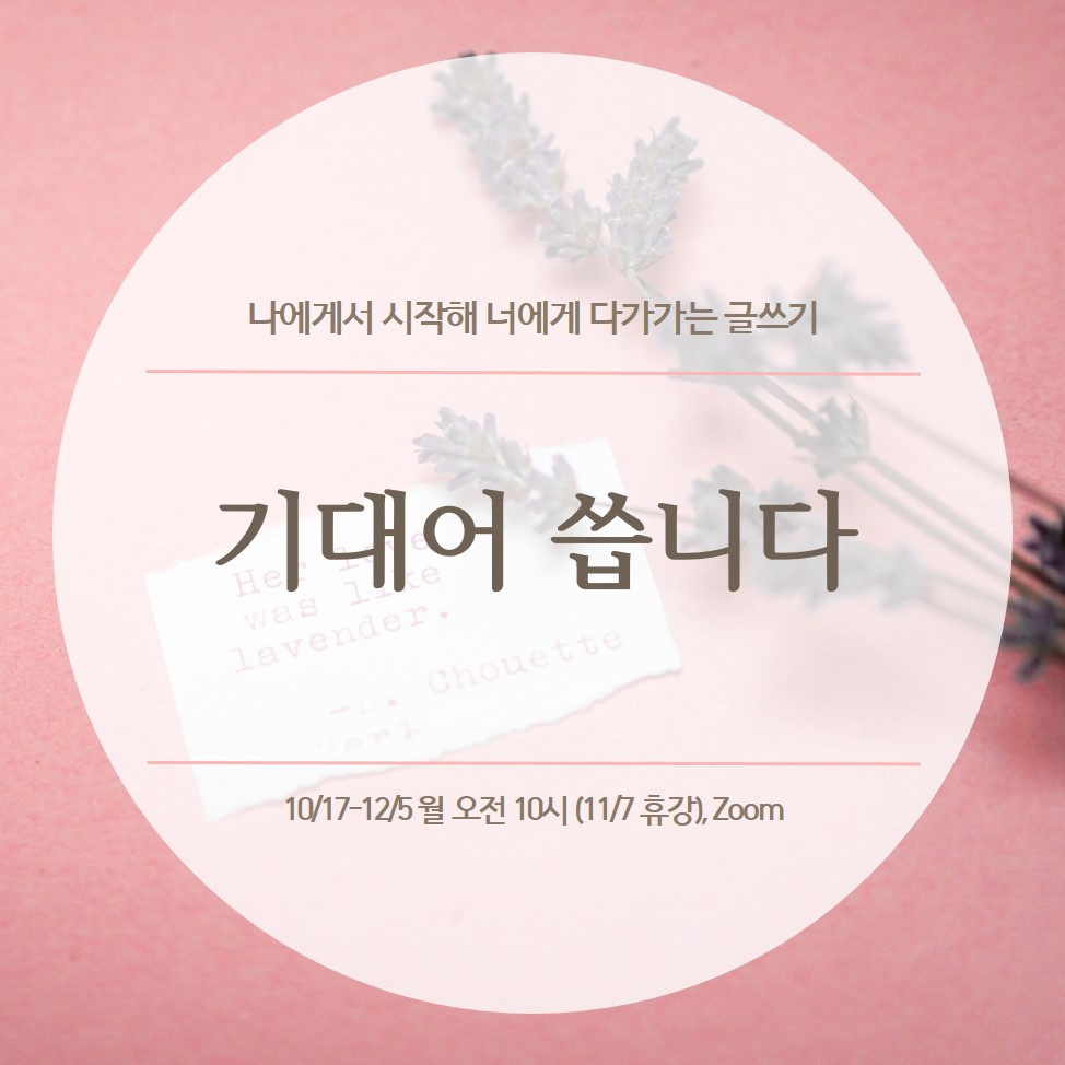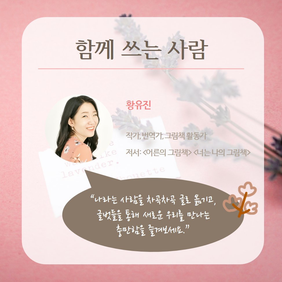 안녕하세요? <어른의 그림책>작가이자 번역가로 활동 중인 황유진입니다. 가을의 한가운데인 10월, 온라인 글쓰기 수업 '기대어 씁니다'를 준비했습니다.