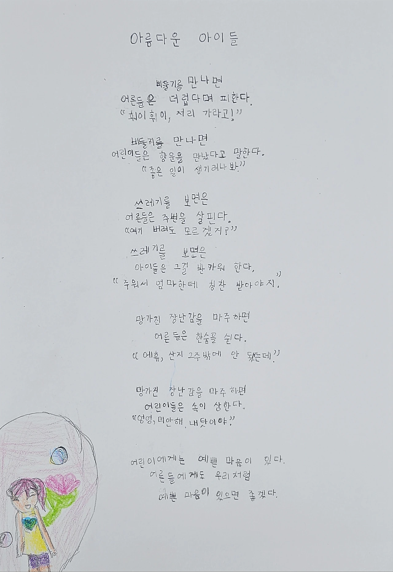 가슴이 벅차올랐다. 좋은 시 덕분이 아니라, 세상을 바라보는 아이의 시선과 생각을 엿볼 수 있었기 때문이다.