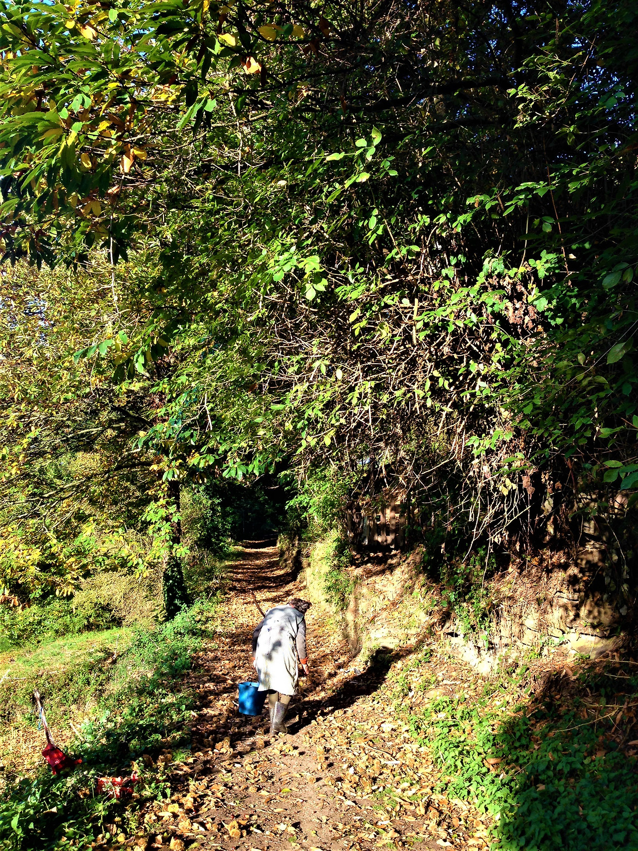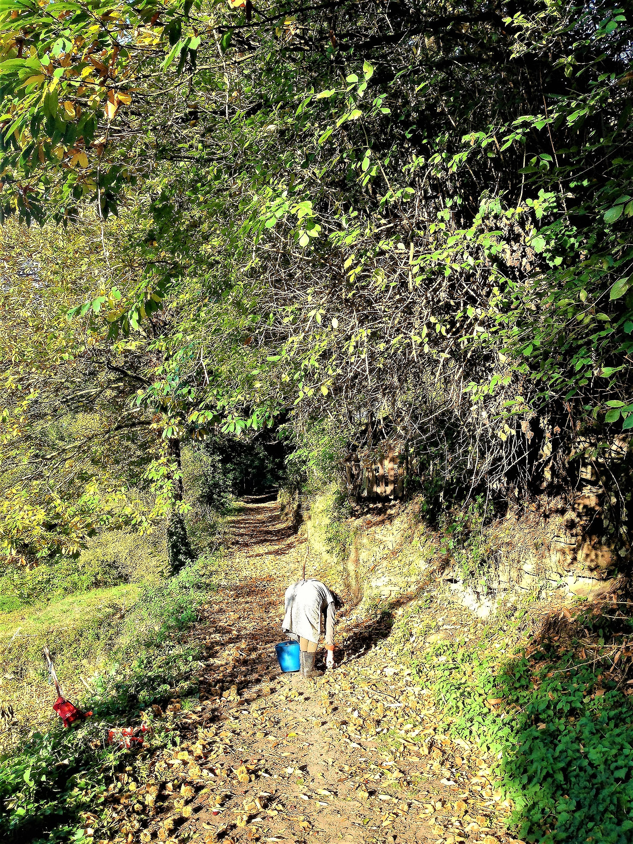 내가 이곳을 지나던 10월 말에는 지천에 밤이 떨어져 있었는데 지나가는 길에 여유롭게 밤을 줍는 현지인들도 몇몇 보았다. 걷는 내내 하늘에서는 비나 눈이 아닌 밤송이가 내렸고 제법 높은 곳에서 떨어지기 때문에 직접 맞으면 좀 아프다. 떨어질 것을 예측하며 간다지만 매번 맞을 때마다 그렇게 깜짝깜짝 놀라게 된다.