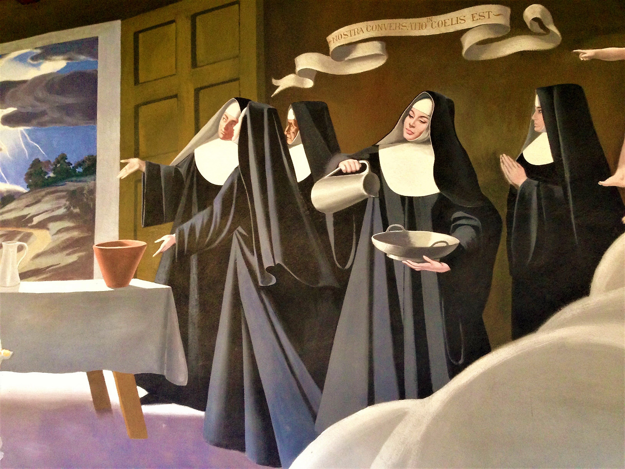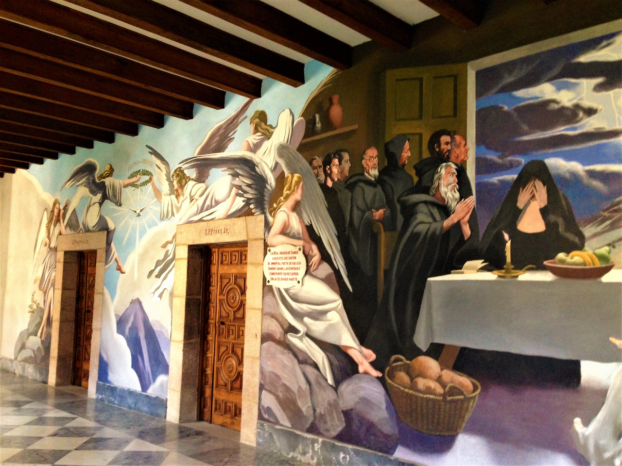 다행히 화제 전환은 누나의 수녀 동료들 덕분에 자연스럽게 이루어졌는데 위 사진에 유독 튀는 수녀[아래 오른쪽 그림에서 주전자를 들고 계신 분] 당대 유명했던 여자 배우를 본떠 그렸다고 한다. Sara Montiel이나 소피아 로렌 등으로 추측한다고 했다. 소피아 로렌은 익히 들어 본 이름이었지만 사라몬티엘은 생전 처음 들어 본다고 하자 그녀는 어서 찾아보라며 검색 찬스를 허용해주었다. 스페인에서 유명한 배우인 것 같았다. 작가의 의도가 뭐냐고 물었지만 그녀는 너무나 시크하게 모르겠다고 했다. 시기적으로 볼 때는 아마 화재 이후 재건하면서 그려진 것이 아닌가 생각한다.
