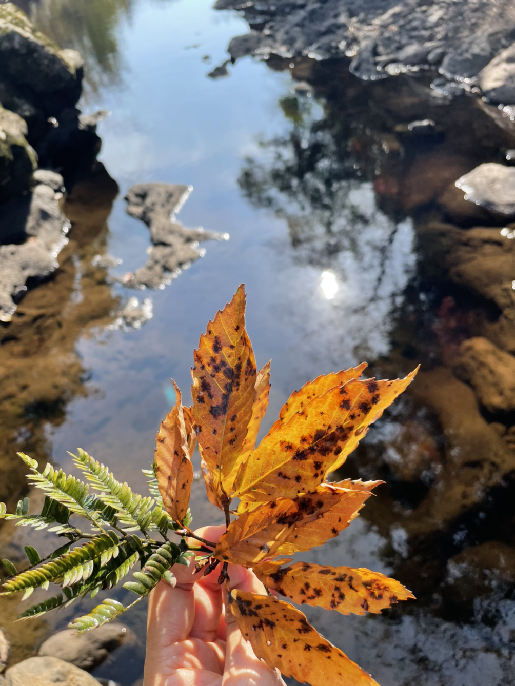 물가 옆 돌 위에 아주 예쁘게 물든 낙엽이 있었다. 누가 일부러 거기 올려놓고 간 것처럼 눈에 잘 띄게 돌 한가운데 꽃처럼. 너는 아무것도 안 하고 있는데 안 쳐다볼 수가 없네. 혼자 중얼거렸다. 그걸 집어서 곧장 물가로 내려가 앉았는데 물 안에 초록 잎을 단 여린가지가 햇살을 받아 반짝였다. 이렇게 예쁜 낙엽도 곧 다 떨어져 앙상한 겨울나무를 볼 것이지만 언제 그랬냐는 듯 초록색 생명이 또 올라와 봄을 알려주겠지. 이 둘을 겹쳐서 들고 있으니 추운만큼 따뜻하고 어두운 만큼 밝은 그런 순환의 꽃다발 같다.
