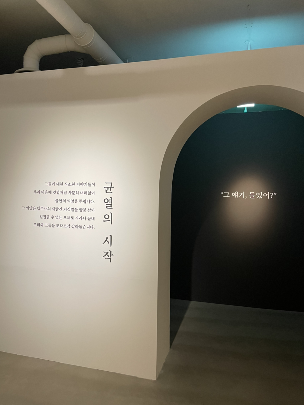 소문의 벽 전시에서는 하나하나의 구멍을 통해 가벼운 뒷담화로 시작한 이야기가 객관적인 사실로 점점 부풀어 가는 과정을 보여준다. 우리는 종종 자신을 투사할 수 없는 상대에 대한 불안감을 이런 집단 내의 '공감'이라는 아름다운 이름에 녹여 버리기도 한다. 공감을 할 수 없는 색깔이 다른 사람은 이상한 사람이다. 는 때론 우아하게 때론 잔인하게 집단의 색을 조정하길 스스로 요구한다. 나치가 자행한 만행도 어찌 보면 이러한 지점에서 시작해서 집단의 광기로까지 발전한 것은 아닐지.