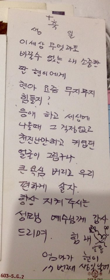 엄마는 매번 생일과 중요한 날에 내게 잊지 않고 편지나 카드를 주셨는데.. 지금까지 모아 놓은 빛바랜 편지와 카드가 한 상자에 가득 차 있다. 엄마는 소녀처럼 가을이 되면 동네에 낙엽을 주워 오셔서 책 사이에 껴 놓았다가 크리스마스에 지인들에게 카드 쓸 때 하나씩 붙여서 드리곤 하셨는데 아마 엄마 주변 분들은 엄마의 낙엽이 붙은 카드를 한 번쯤은 다 받아 보셨을 것이다. 나에게는 특별히 행운의 네잎 클로버도 가끔 함께 붙여주셨다. 학생 때 내가 공부로 스트레스 받는다고 세상 다 산 듯한 표정으로 다니면 엄마는 욕심을 버리고 편하게 살자라고 자주 써주셨는데 수험생이 실제로 그저 편할 수는 없지만 -.- 그래도 안정이 되곤 했다.