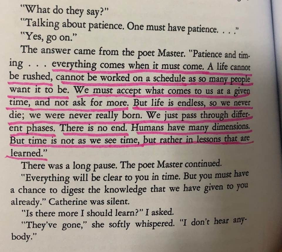 이 책이 흥미로운 이유는 단순히 그녀의 전생 이야기들을 전달하는데 끝나는 것이 아니라(사실 이런 호기심이라면 그걸 충족시켜 줄 자극적인 사례들은 조금만 찾아봐도 넘친다. 그중엔 주목받기 위해 구라를 치는 경우도 종종 섞여있을 것 같다;) 특히 그녀의 수많은 죽음들? 그 이후의 경계점에서 받는 메시지는 거대한 주제들에 대한 나름의 답을 제공한다. 이 메시지를 통해 죽음 후에 궁금했던 것들, 우리는 왜, 대체 뭐하러 살고 있는가, 왜 이런 경험들을 하며 살아야 하나, 이런 질문들의 해답을 찾는데 도움이 될 수도 있을 것이며, 개인적으로는 다른 차원의 깊은 위안을 받았다. 브라이언이 개인적인 임상 경험을 통해 캐서린의 삶뿐만 아니라 그의 삶이 변화했듯 그처럼 나 역시 죽음이 더이상 두렵지 않고, 나에게 일어나는 모든 일(나쁜 일 포함)에 보다 더 관대한 시각을 갖게 되었다. 단순히 엄마의 영혼이 어딘가에서 나를 기다리고 있을 거야, 혹은 천국에서 만나요 이상의 강렬한 희망이다.