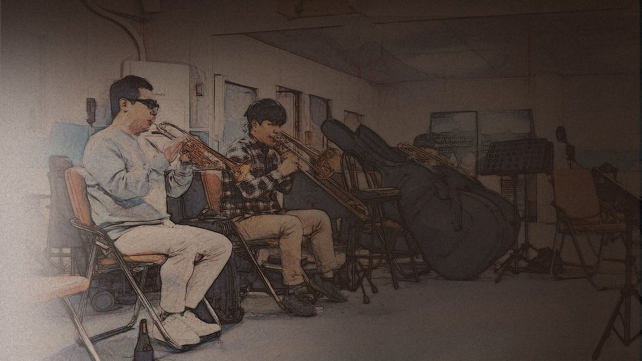 지휘자가 연습을 중단시키더니 트럼펫과 트럼본 연주자를 보면서 말했다.