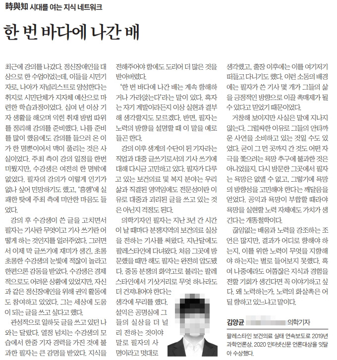 강의 후 수강생이 쓴 글을 고치면서 난 기사란 무엇이고 기사 쓰기란 어떻게 하는 것인지를 일러주었다. 그러면서 이제 막 글쓰기에 재미가 생긴, 초롱초롱한 수강생의 눈빛에 적잖이 놀라고 한편으론 감동을 받았다. 수강생은 경제적으로도 어려운 상황에 있었지만, 자신과 같은 정신장애인을 위해 권익 활동도 펴고 있었다. 그는 세상에 도움이 되는 글을 쓰고 싶다고 했다.