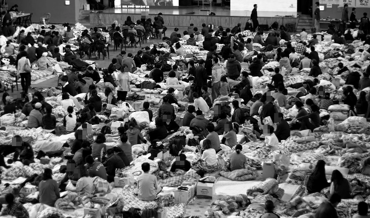 체육관 입구. 각종 단체에서 마련한 급식소가 줄지어 있다. 식사를 마친 남자가 짜증 섞인 목소리로 전화를 받는다. “무슨 현장 중계를 하라는 거야.” 수화기 너머 어떤 대꾸가 돌아왔는지 알 수 없다. 그러나 남자의 목소리가 한결 누그러진다. “어떻게 하면 되는데?” 남성이 입은 재킷에 방송사의 로고가 반짝거린다.