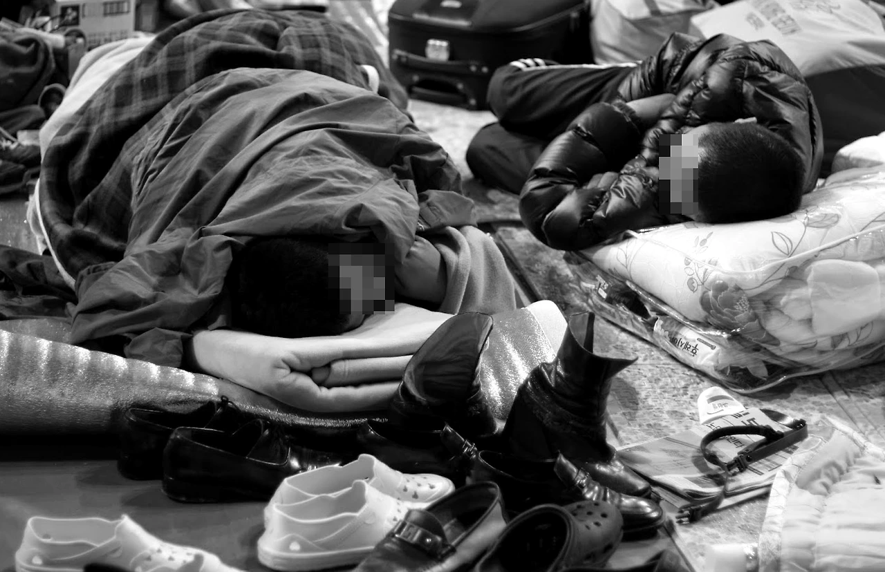 2층 관람석에서 중년남성이 꾸벅꾸벅 졸고 있었다. 그 모습을 지켜보던 여인이 남자를 툭 친다. “왜 여기서 자고 있어? 밑에 가서 좀 누워” 남자는 대꾸 없이 손을 젓는다. 여인의 목소리가 높아졌다. “됐긴 뭘 돼. 따라와.” 소매를 잡아끌자 남자는 못 이기는 척 따라나선다. 실종자 가족들은 단지 기다릴 뿐 이곳에서 딱히 할 수 있는 게 없다. 잠자는 모습을 가족에게 보이기 싫은 가장의 자존심과 바닥난 체력은 그를 2층 구석으로 이끌었으리라.