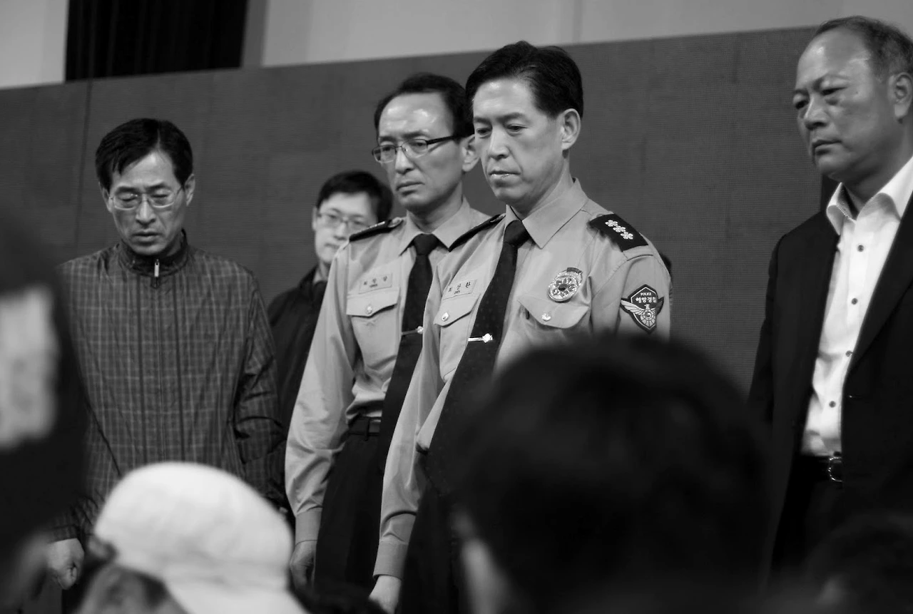 취재진이 모여있는 관람석으로 올라가는 계단. 중간에 중년의 여자가 빨대를 물고 음료수를 마시고 있었다. 눈두덩이는 퉁퉁 부어있었다. 눈은 이미 붉게 충혈된 상태다. 그는 하릴없이 창밖을 보고 있었다. 시선 끝 어디에도 바다는 보이지 않지만, 여인은 바다를 찾고 있었다. 아직 아이가 바다 속에 있었다.