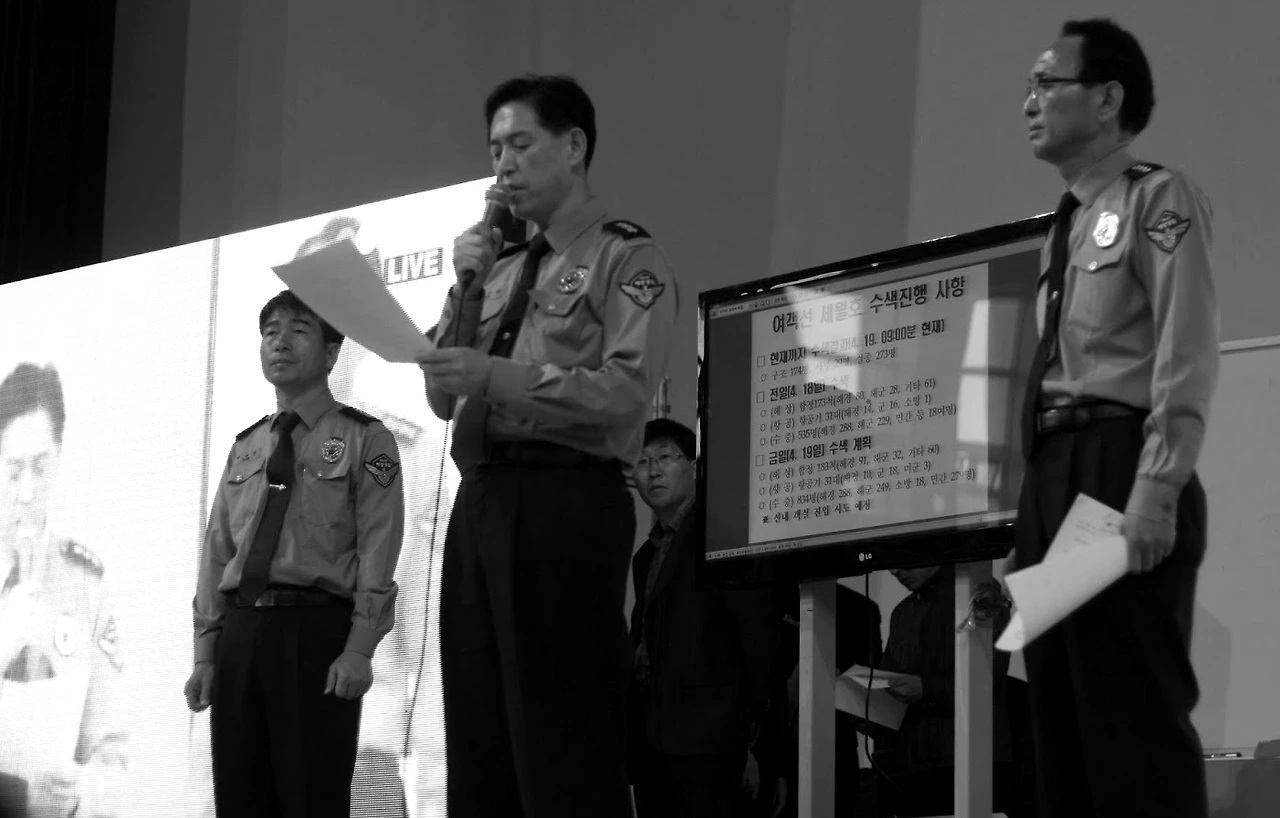 2014년 4월 19일 오전 10시 진도실내체육관. 해양경찰청의 구조 상황에 대한 공식브리핑이 이뤄졌다. 책임자는 굳은 표정으로 준비해온 종이를 읽어나갔다. 브리핑은 하루 세 번, 오전 10시, 12시, 그리고 오후 2시에 이뤄진다. 해경이 읽는 내용은 현장 생중계로 전면의 전광판을 통해 동시에 방영됐다. 실종자 가족들은 모두 숨을 죽였다.