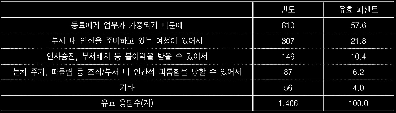 조사를 세분화해 임신·출산 경험이 있는 여성 응답자가 자유로이 임신을 결정할 수 없었던 이유를 확인하자, 그 이유는 더 명확하게 드러났다. 응답자의 절반이 넘는 57.6%가 “동료에게 업무가 가중되기 때문”이라고 밝힌 것이다. 이밖에도 “부서 내 임신을 준비하고 있는 여성이 있다”에 21.8%가, “인사승진이나 부서배치 등에 불이익을 받을 수 있다”가 10.4%, “눈치와 따돌림 등 조직 및 부서에서 인간적 괴롭힘을 당할 수 있다”는 6.2% 등으로 조사됐다.