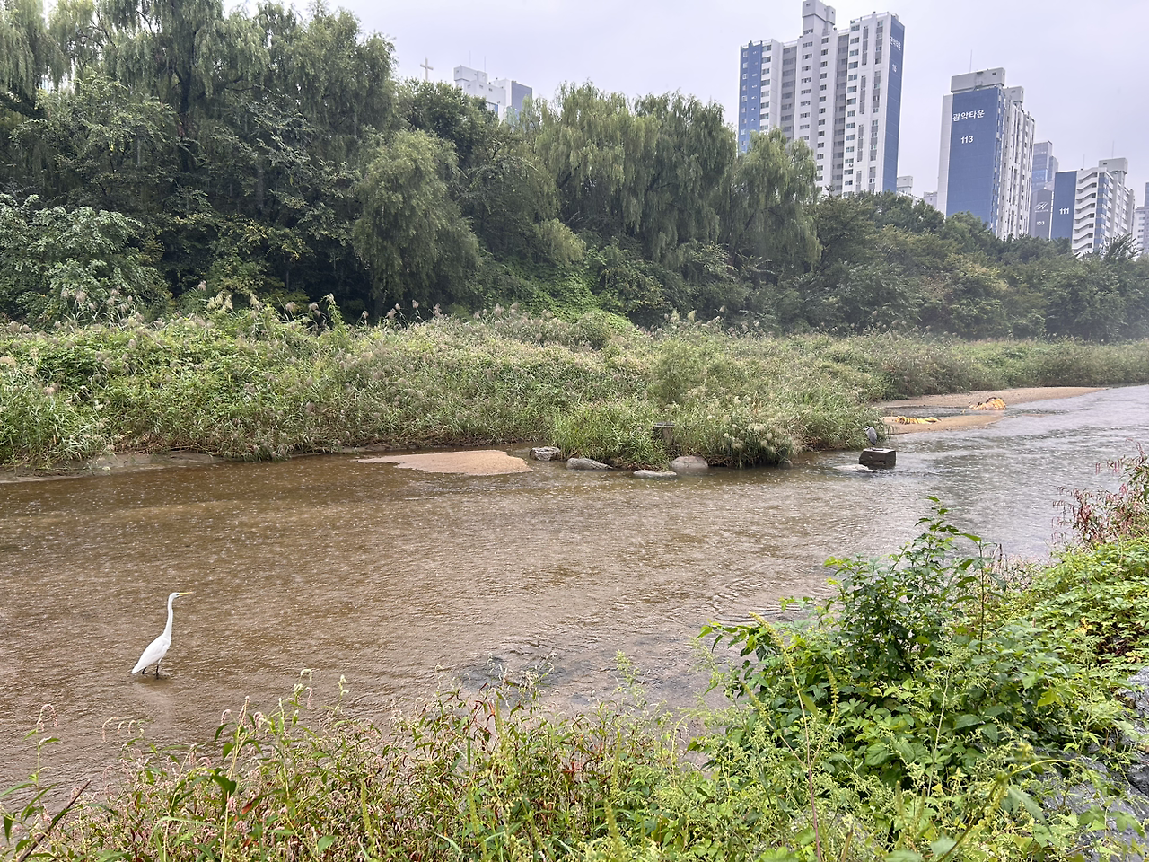 물의 수위가 조금 높아진 안양천에는 두루미 두어 쌍이 종종 모습을 드러낸다. 보통은 어슬렁어슬렁 안양천을 걷거나 가만히 한 곳에 얼음처럼 서 있는 편인데 가끔 운이 좋으면 나처럼 두루미가 물고기를 사냥하는 장면을 목격할 수도 있다. 두루미는 인형처럼 가만히 서 있다가 어느 순간 물고기를 낚아채고 부리로 물어 한참을 흔든다. 이내 물고기를 꿀꺽 삼켜 그 얇고 긴 목 아래로 물고기를 꾹꾹 눌러 내려보낸다. 신기하게도 이런 장면을 두어 번 더 목격했는데 모두 비 오는 날이다.