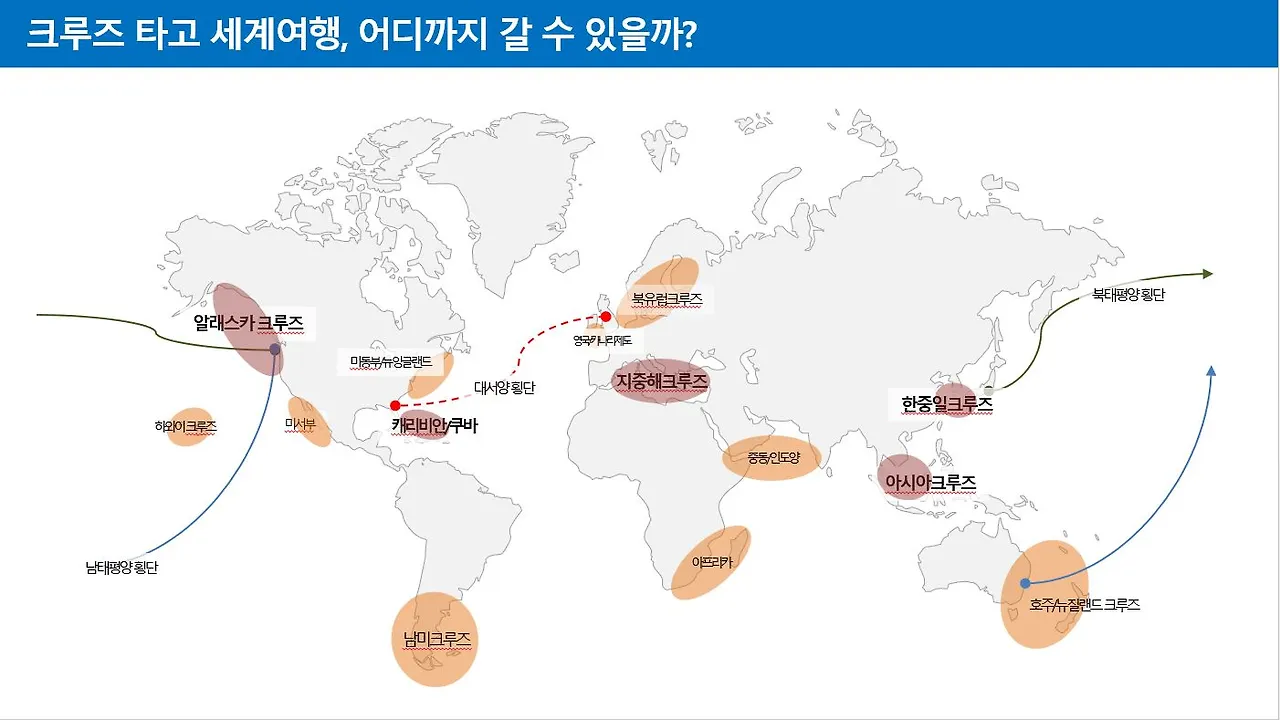 그럼, 크루즈 여행을 떠나기 전, 과연 크루즈를 타고 어디까지 갈 수 있을지 알아보도록 하자.