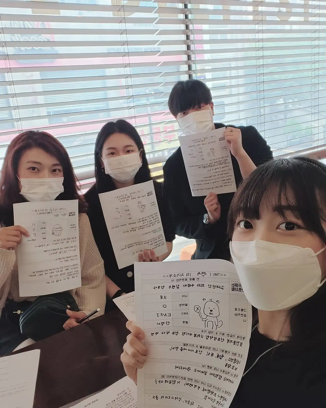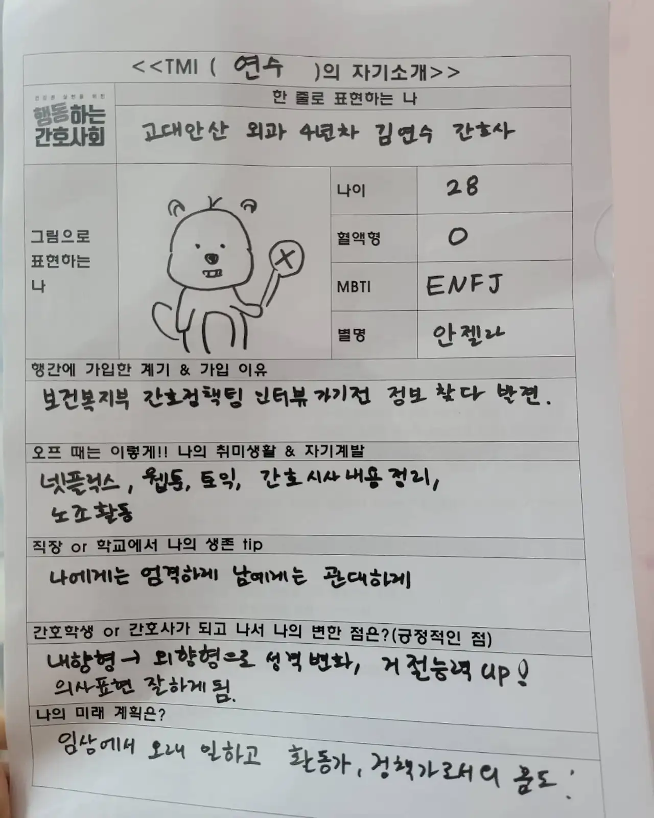 임상이 아닌 보건관리자 업무를 시작하신 고연차 선생님, 중간 연차인 나, 신규 선생님, 학생 선생님 이렇게 넷이 모여서 신입 회원 환영회를 했다. 정말 즐겁고 힐링되는 시간이었다. 내가 만든 TMI 자기소개 양식으로 자기소개도 하고 고민도 주고 받았다.