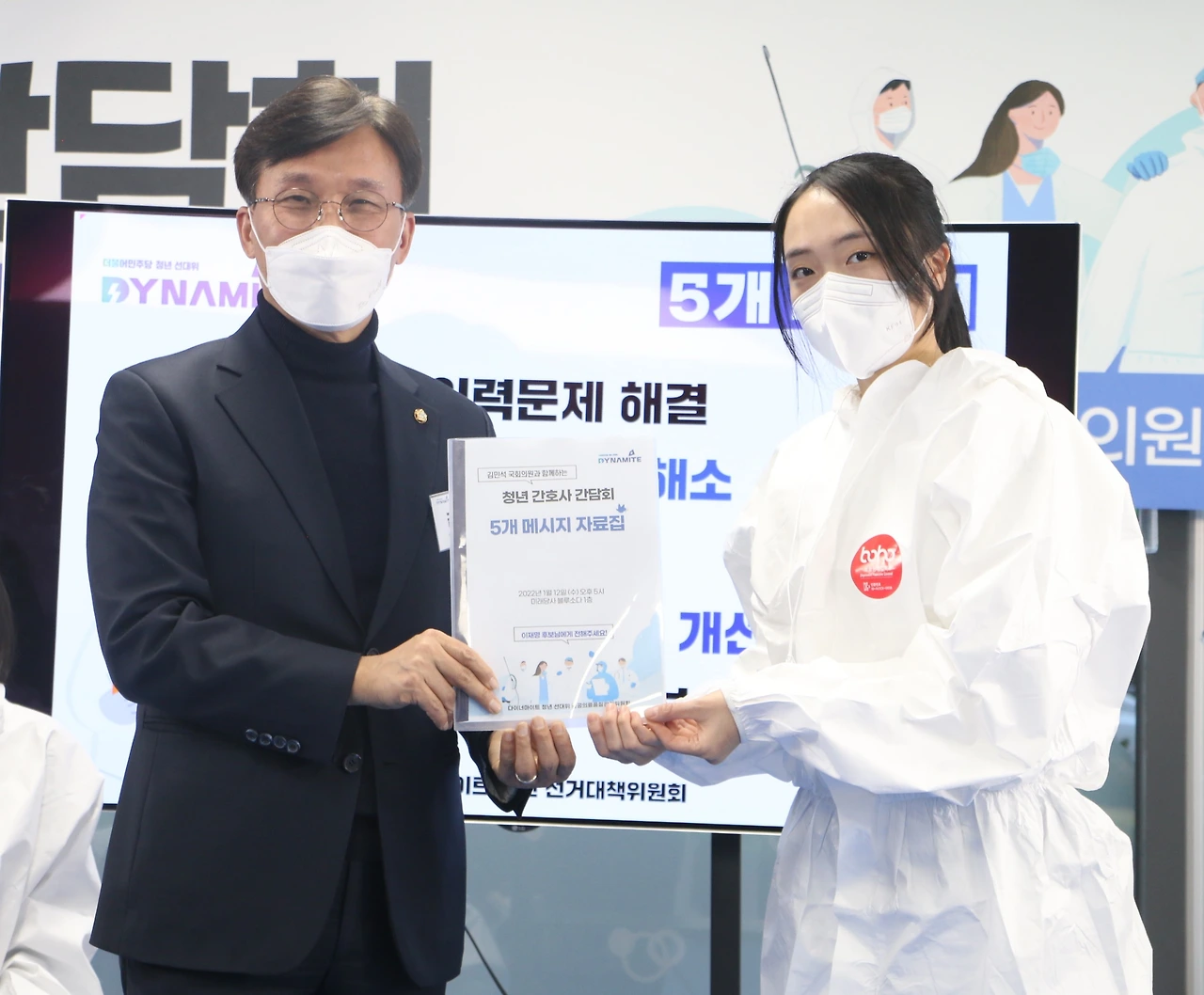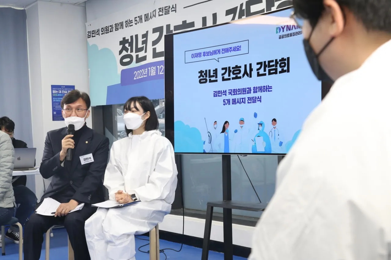 간담회에는 국회 보건복지위원회 김민석 위원장님과 권지웅 서난이 청년선대위 공동위원장님이 참여하셔서 청년 간호사들의 전하는 5가지 메시지를 듣고 응답해 주셨습니다.