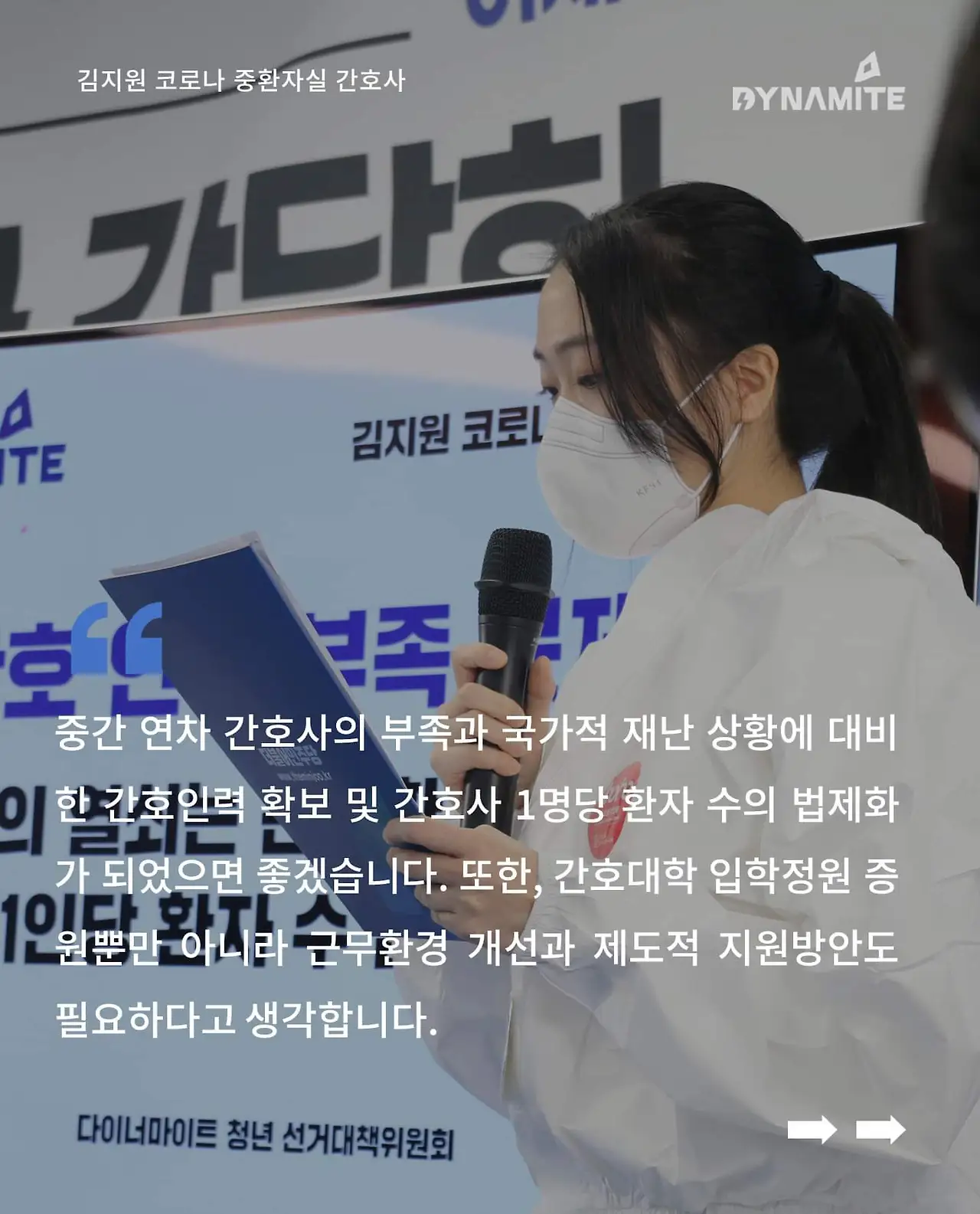 김지원 간호사님은 서울의 상급종합병원 코로나 전담 중환자실에 근무하는 간호사로 국가적 재난 상황에 대비한 간호인력 확보와 간호사 1명당 환자 수 법제화를 요청했습니다. 단순히 간호대학 입학정원 증원이 아닌 근본적인 근무환경 개선과 제도적 지원방안을 요청했습니다.