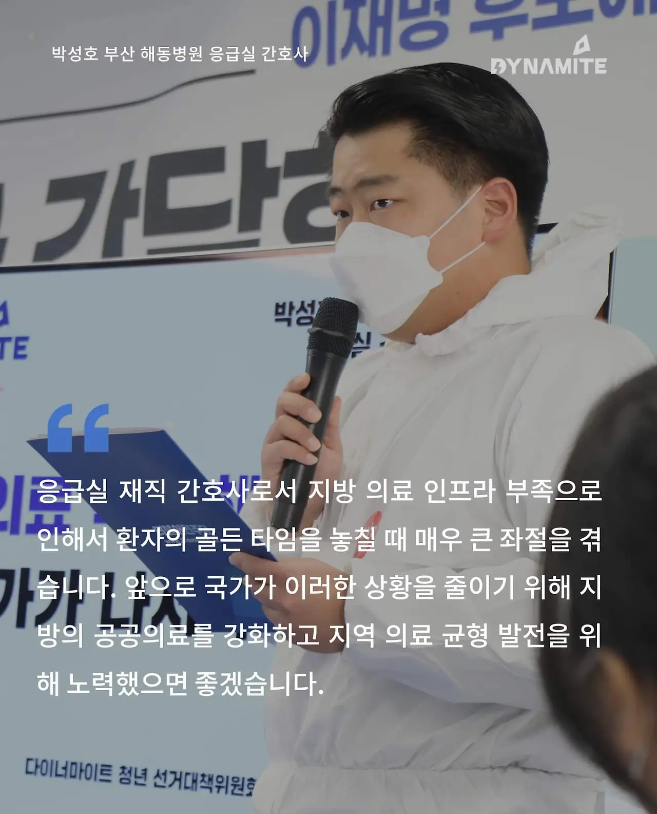 박성호 간호사님은 부산의 한 병원 응급실에서 재직 중인 간호사로 이재명 후보 국가인재위원회 2차 영입인사입니다. 지방 의료 인프라 부족으로 인해 코로나 환자의 골든타임을 놓칠 때 좌절을 겪었다고 합니다. 지방 지방의 공공의료 강화와 지역 의료 균형 발전을 위해 국가가 책임을 분담해 달라고 요청했습니다.
