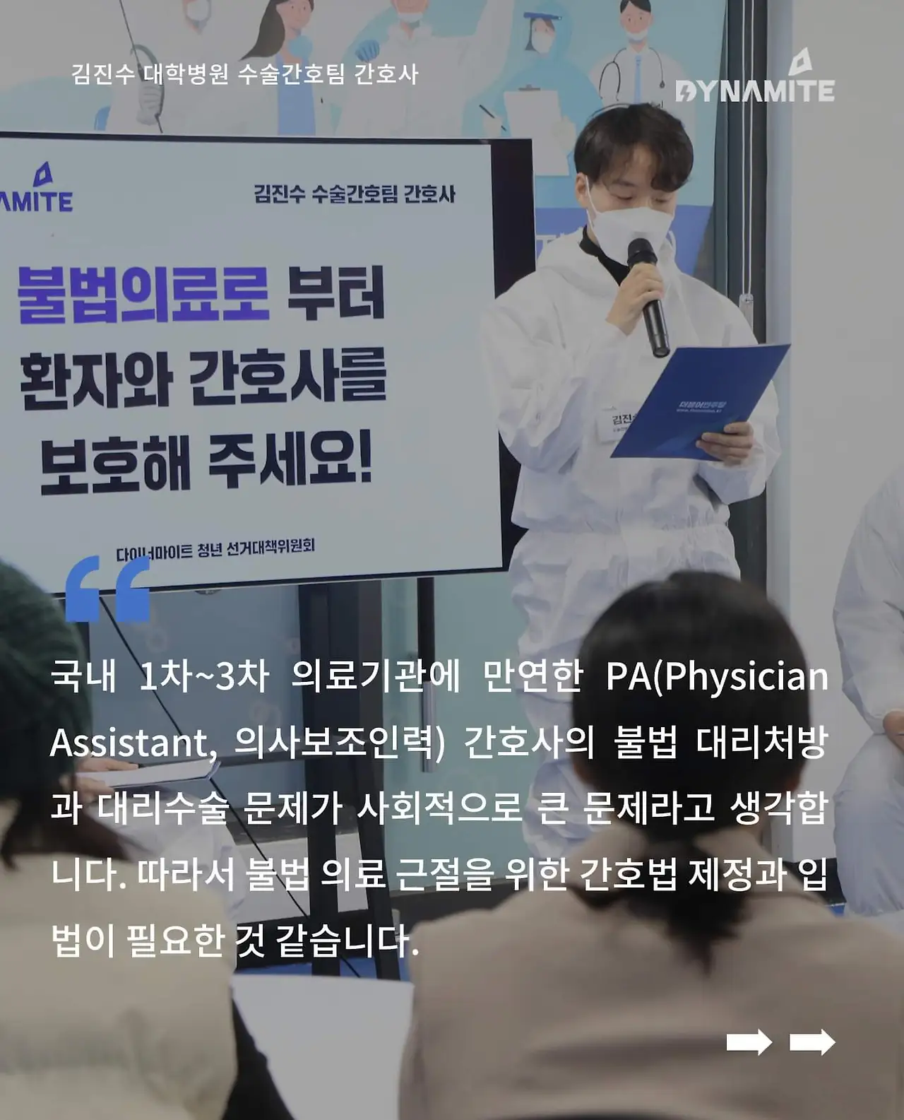 김진수 간호사님은 서울의 한 대학병원 수술간호팀에서 근무 중인 간호사로 「청춘 간호사의 세계 병원 여행」 작가이십니다. 김진수 선생님은 국내의 3차병원부터 1차 의료기관 까지 만연한 PA(Physician Assistant, 의사보조인력)간호사의 불법 적인 대리처방, 대리수술 문제에 대해 이야기했습니다. 불법의료 근절을 위해 의료법 개정 또는 간호법 제정안에 간호사 업무를 상세히 규정할 것을 요청하고 전문간호사 자격인정 등에 관한 시행규칙 일부개정령안의 입법을 촉구하였습니다.