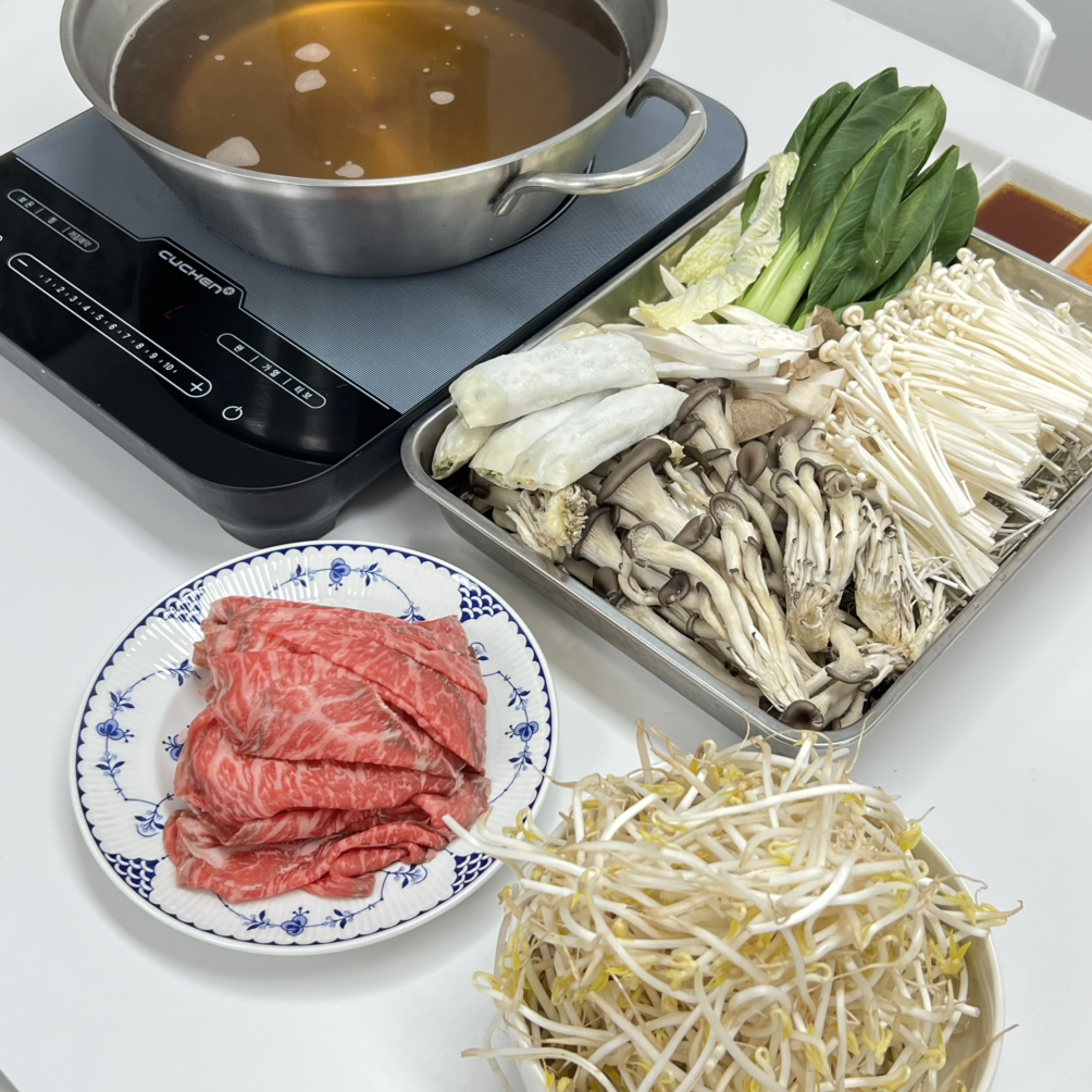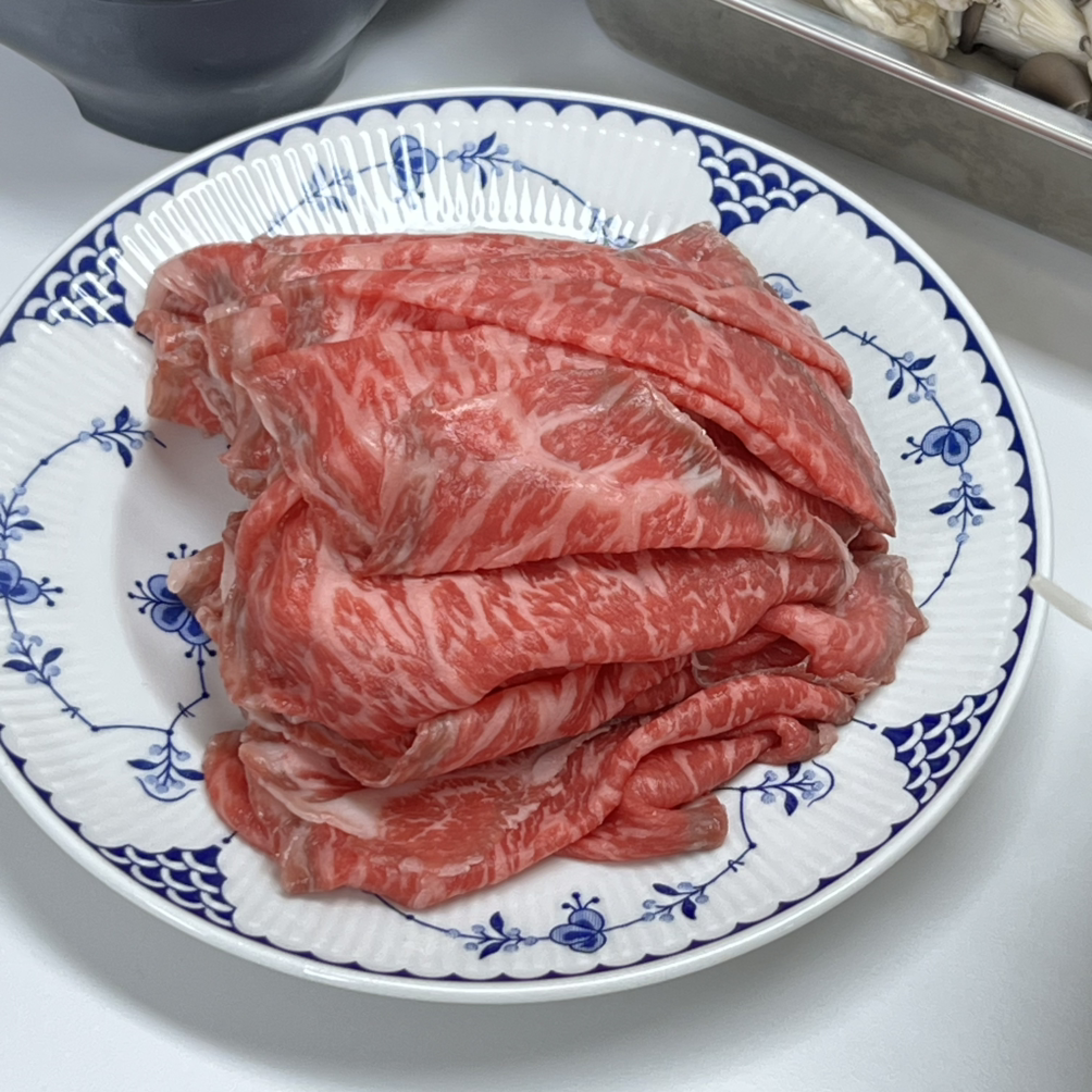 샤브용 고기는 근처 정육점에서 바로 전에 사서 와요. 등심이나 채끝과 달리 샤브용 부위는 저렴해요. 단골 정육점에 미리 시세를 알아보시는 것을 추천합니다. 저는 100g에 4,000원대로 구입하는 편이에요.