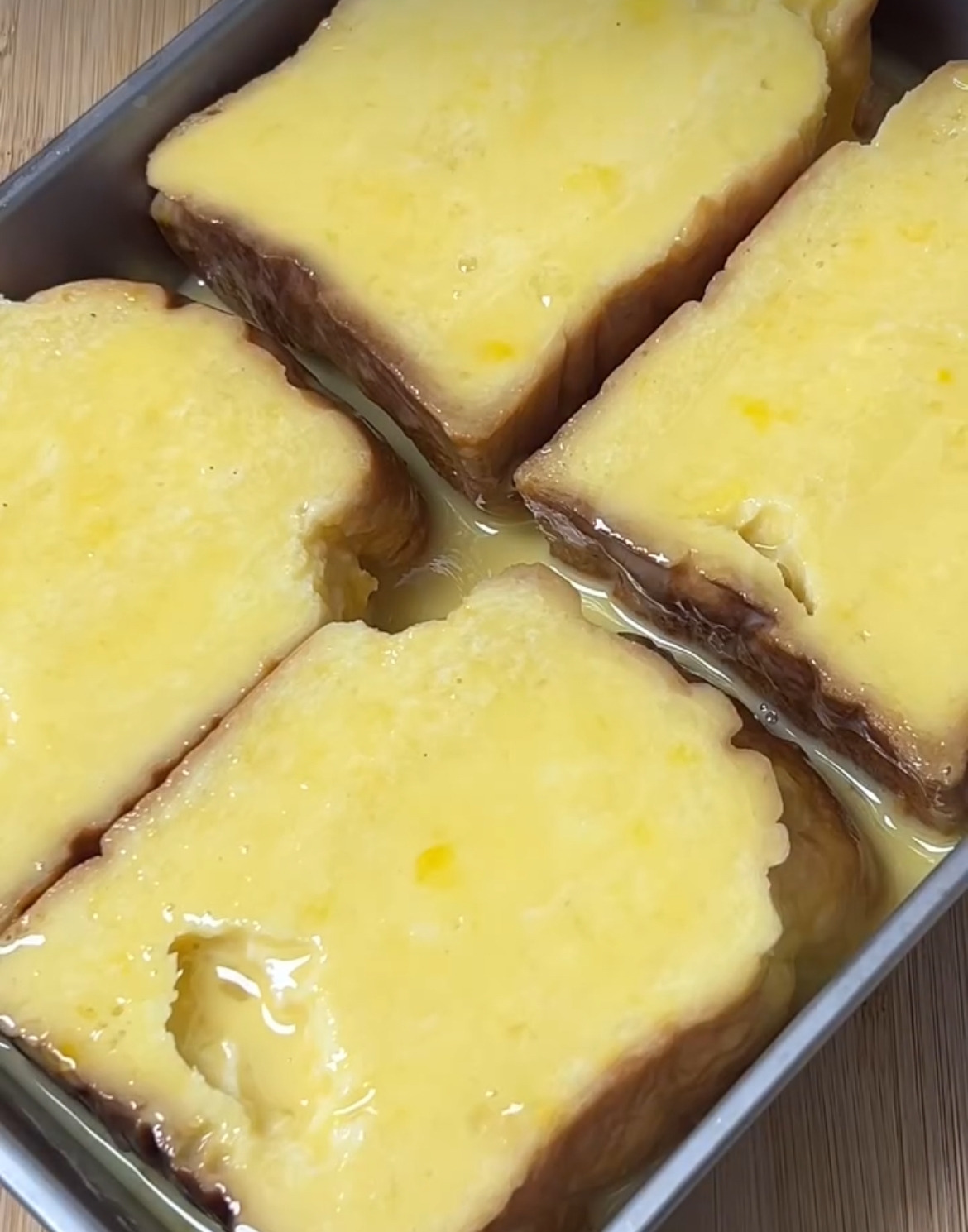 3. 식빵을 앞뒤로 골고루 계란물에 적셔준 뒤 밀폐용기에 넣고 약 12시간 냉장 보관해 주세요. 이렇게 하면 속까지 촉촉하게 배어들어요.