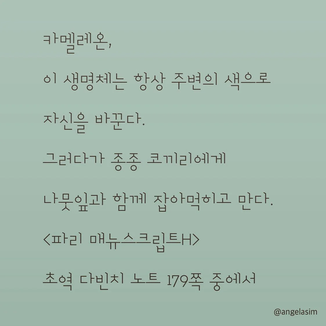 하지만 나를 보호하기 위해 주변의 색깔에만 맞춰 살다가는 나도 모르는 사이 내가 사라질 수도 있는 일이에요.