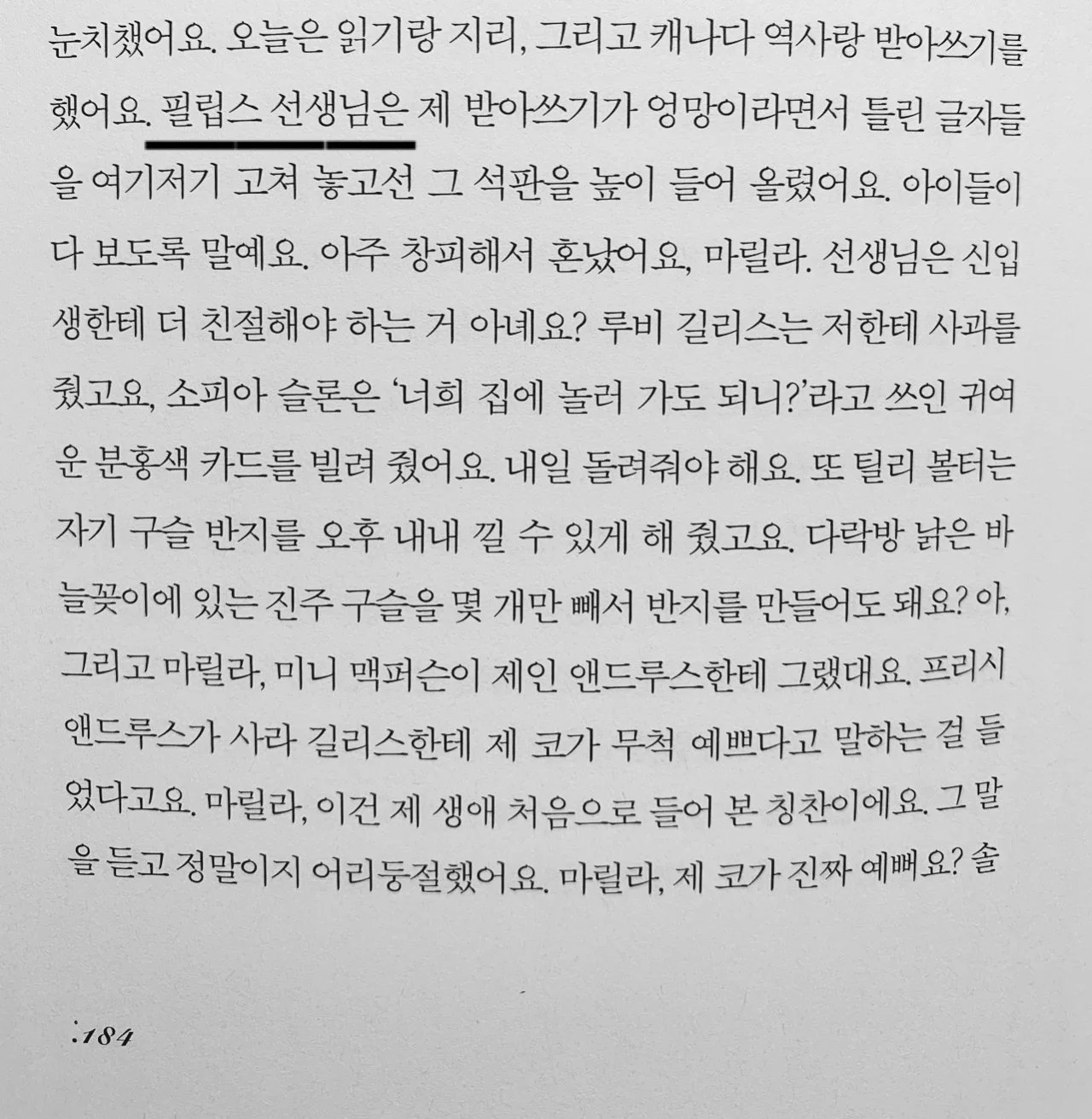 “필립스 선생님은 제 받아쓰기가 엉망이라면서 틀린 글자들을 여기저기 고쳐 놓고선 그 석판을 높이 들어 올렸어요. 아이들이 다 보도록 말이에요. 아주 창피해서 혼났어요.”[빨강 머리 앤_루시 몽고메리]