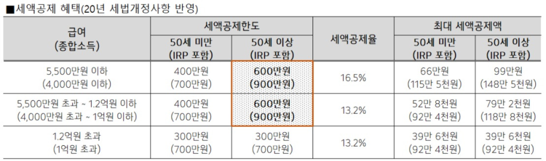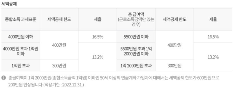 3) 1+2의 세액공제는 세금에 대한 이연효과가 있는 것으로, 55세 이후 연금을 수령할 때 세금을 내야 한다.