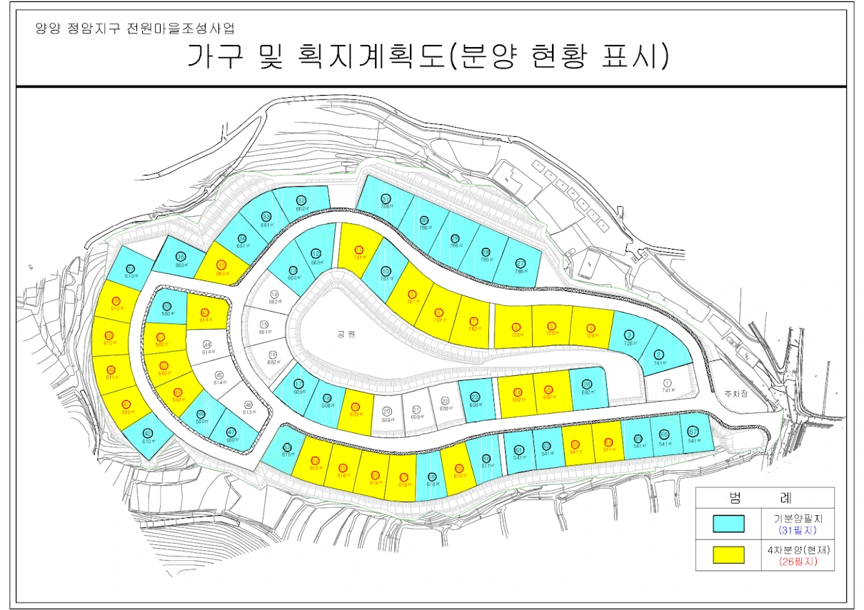 아래 획지계획도를 보면, 바다를 오른쪽으로 두고 조성된 모습인데, 나는 남향이 좋아 가장 아래쪽 라인을 생각하고 있었다. 기존 분양만 해도 아래쪽 라인은 좀 남아 있는 모습인데, 이번 4차 분양 때 한번에 다 계약이 되었다. 1차, 2차 때 워낙 계약이 안 이루어진 곳이기에, 주식으로 돈을 좀 불려서 계약을 하자는 생각이었는데...