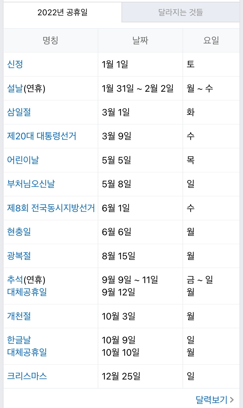 - 2022년의 법정 공휴일(토/일요일인 날들 제외)하면 13일 + 토요일 53개 + 일요일 52개 = 총 118일