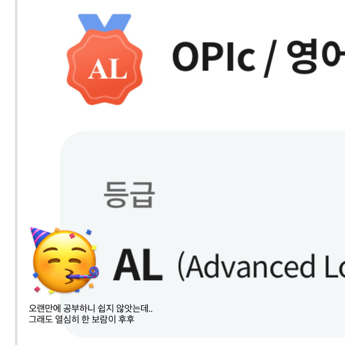 회사 교육 프로그램의 일환으로 영어 수업을 듣게 됐습니다. 수업을 듣는 것까지는 좋았는데 종료 후에 영어 성적을 강제로(ㅠㅠ) 내야 했어요. 마지막으로 오픽을 본 게 무려 7년 전이었고, 그 후로 영어 공부를 각 잡고 한 적이 없었습니다. 업무에서도 영어를 쓸 일이 크게 없어서 휴가 때 여행을 가서 대화를 하는 정도가 다였어요. 오랜만에 영어, 그것도 말하기 시험을 볼 생각을 하니까 걱정이 앞서더라고요.. 이대로는 안 되겠다는 생각에 공부 계획을 촘촘하게 짰습니다. 그리고 마침내.. 3주 만에 AL을 달성했습니다! (쨕쨕)