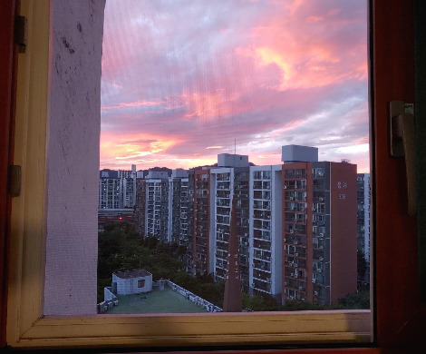 노을이 지는 하늘. 아파트 위에 불꽃 파도가 넘실댄다.