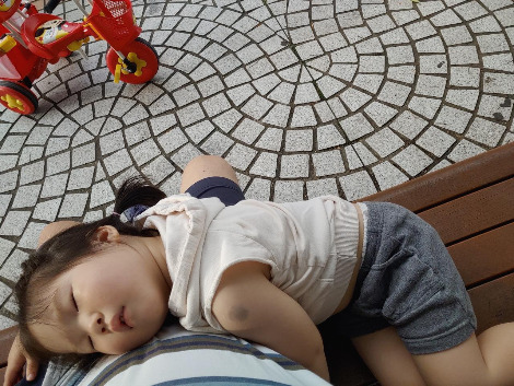 결국 공원 입구에 있는 벤치까지 자전거를 끌고 가서 낮잠을 재웠다.