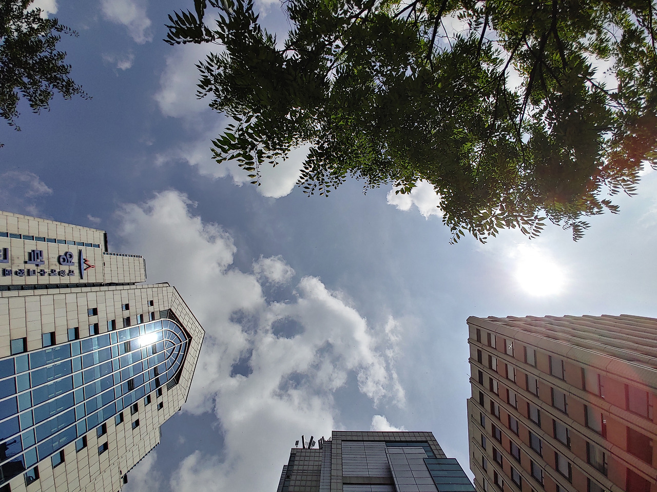 맑은 하늘 아래 많은 사람들이 따뜻한 햇살을 만끽하고 거기를 걷고 있다.