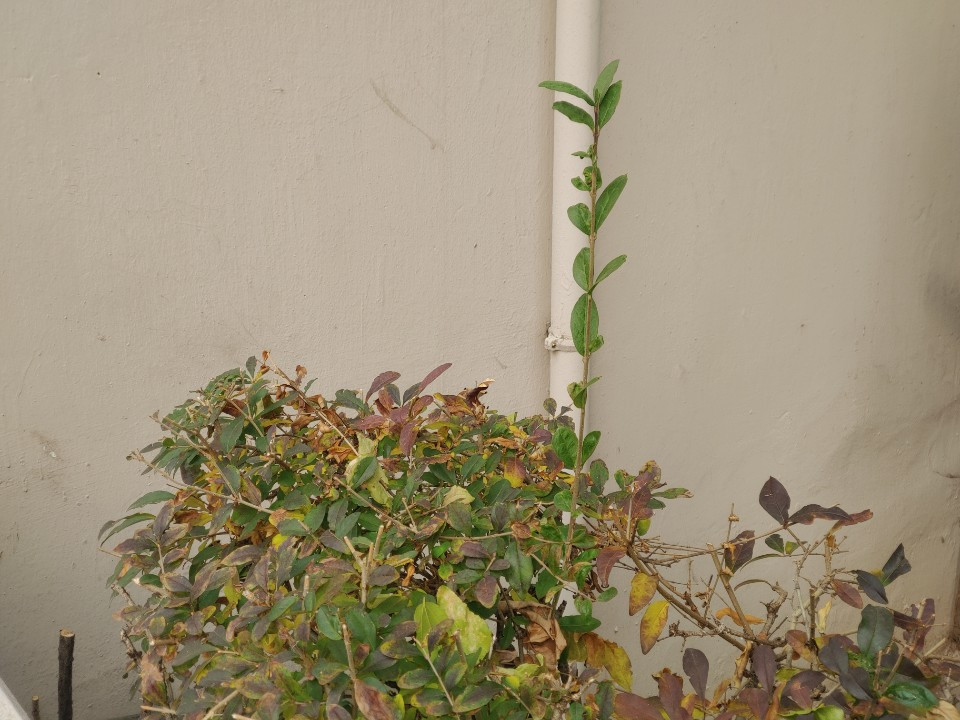 집 앞 나뭇가지들 중 유독 한 가지만 위로 파릇파릇하게 자라고 있다.