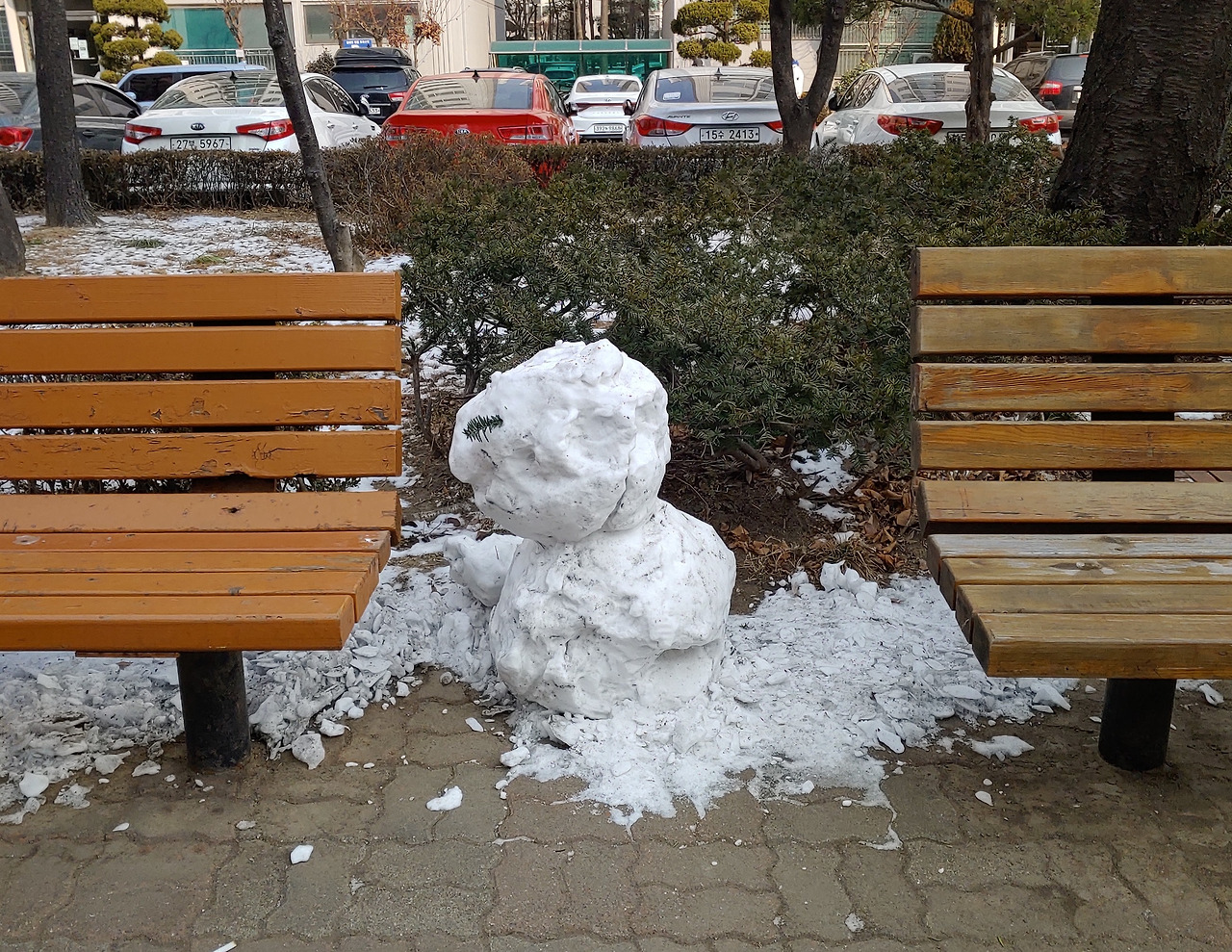 주말 오후, 집 앞 공터 앞에 눈사람이 홀로 서있다.