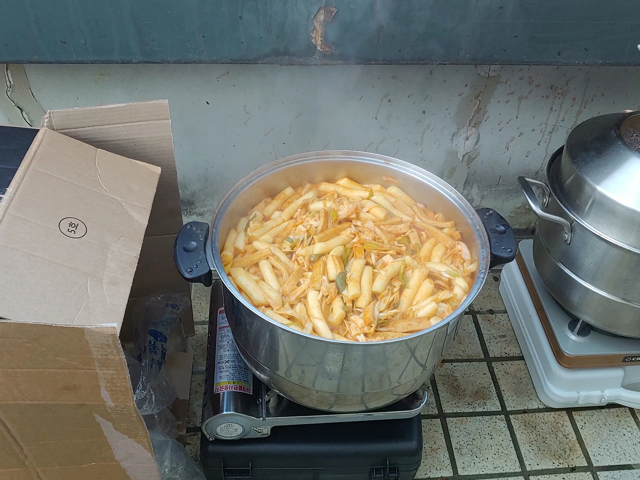 가스버너 위에 들통을 올려놓고 그 안에 재료를 쏟아붓는다.