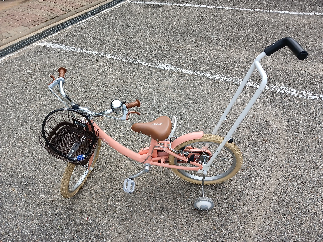 보조 바퀴 달린 자전거를 신나게 밟는 딸.