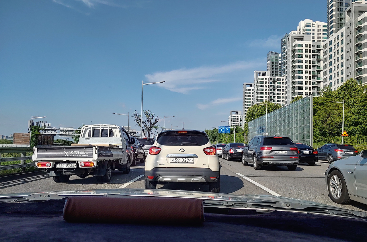 처음에는 탁 트인 도로를 달리고 있었는데 어느샌가 차들이 옆에 붙어있다.