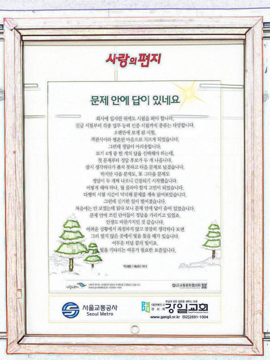 지하철 기다리는 승객들의 마음을 따뜻하게 만드는 글귀.