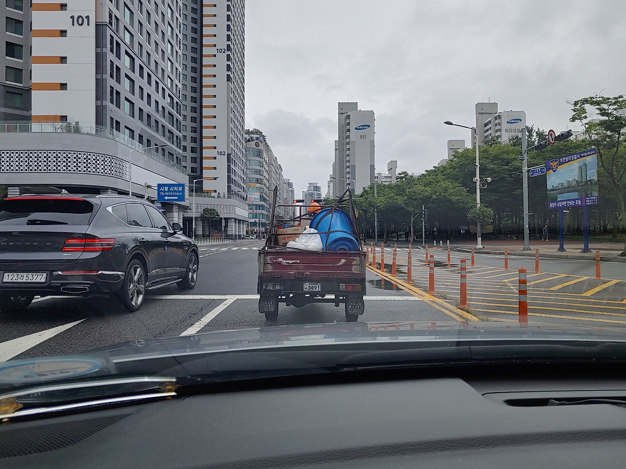 내 앞에 오토바이 개조형 트럭이 껴들었다.