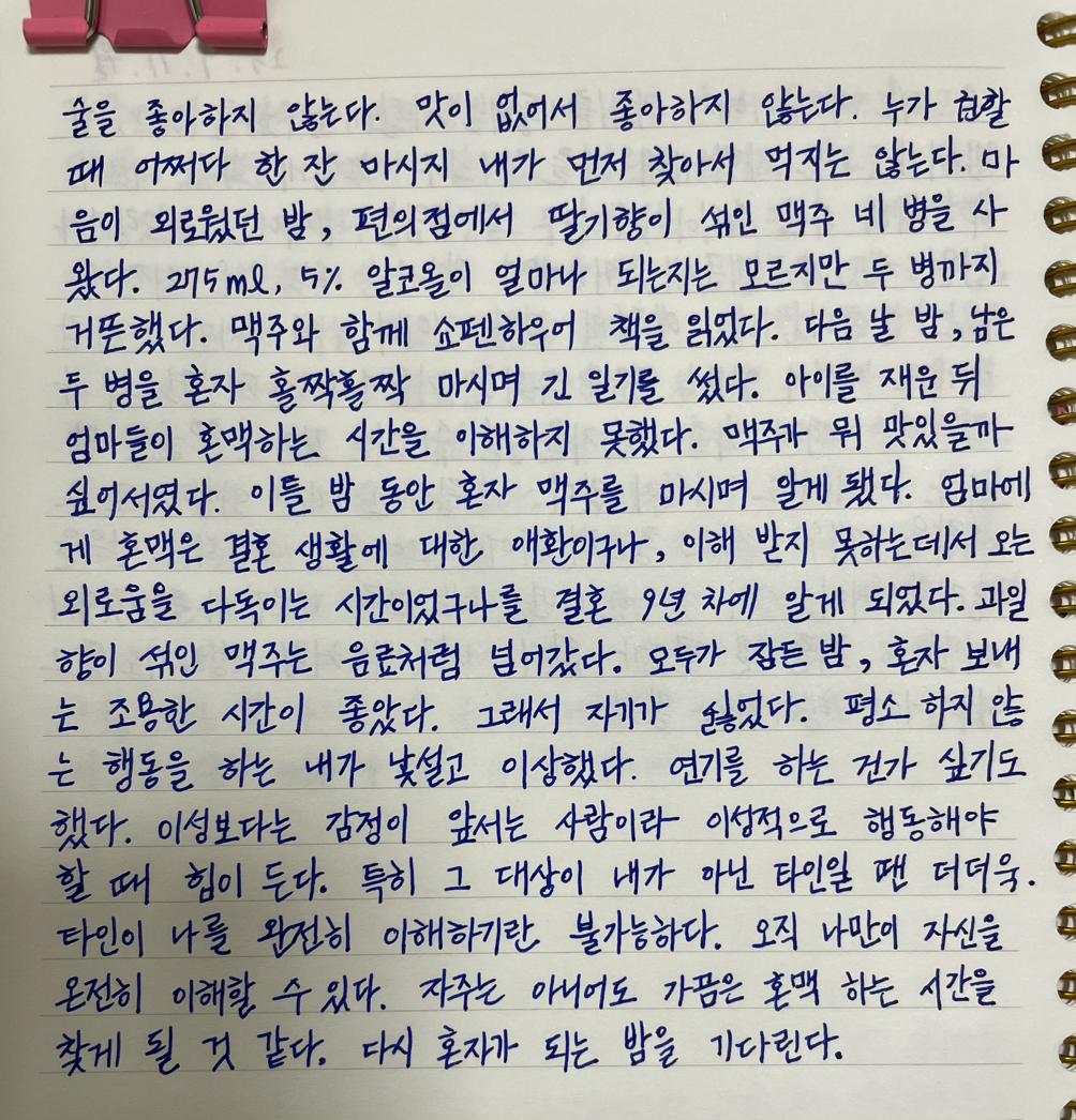 다음 날 밤, 남은 두 병을 혼자 홀짝홀짝 마시며 긴 일기를 썼다.
