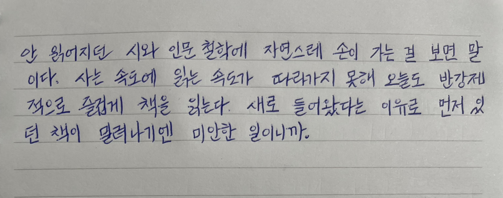 사는 속도에 읽는 속도가 따라가지 못해 오늘도 반강제적으로 즐겁게 책을 읽는다.