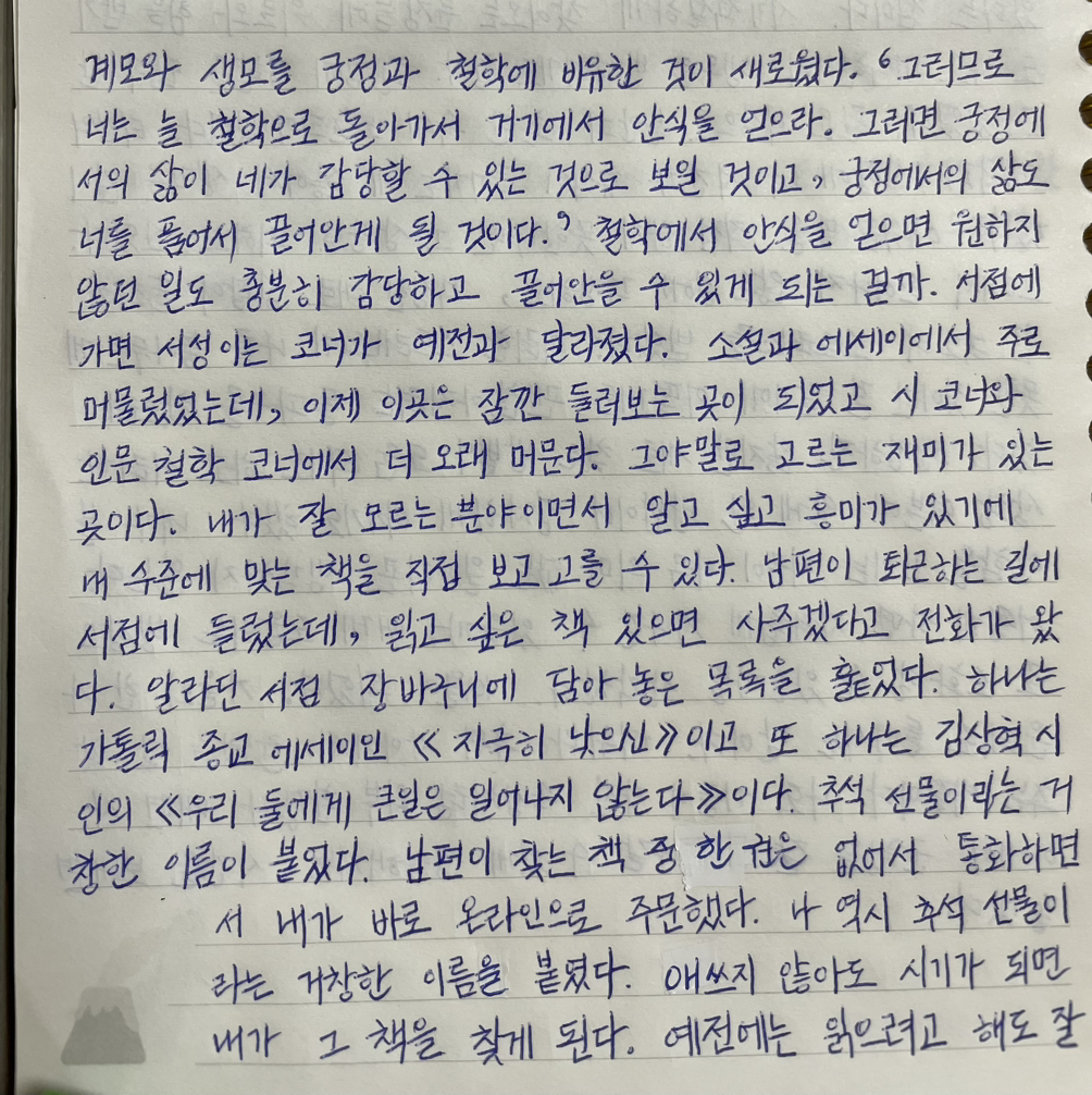 예전에는 읽으려고 해도 잘 안 읽어지던 시와 인문 철학에 자연스레 손이 가는 걸 보면 말이다.