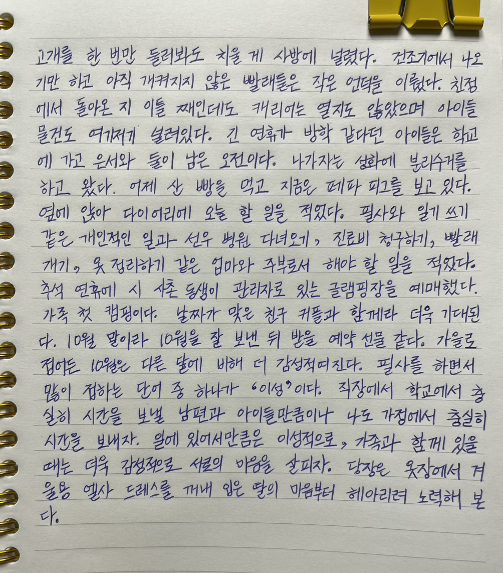 필사와 일기 쓰기 같은 개인적인 일과 선우 병원 다녀오기, 진료비 청구하기, 빨래 개기, 옷 정리하기 같은 엄마와 주부로서 해야 할 일을 적었다.