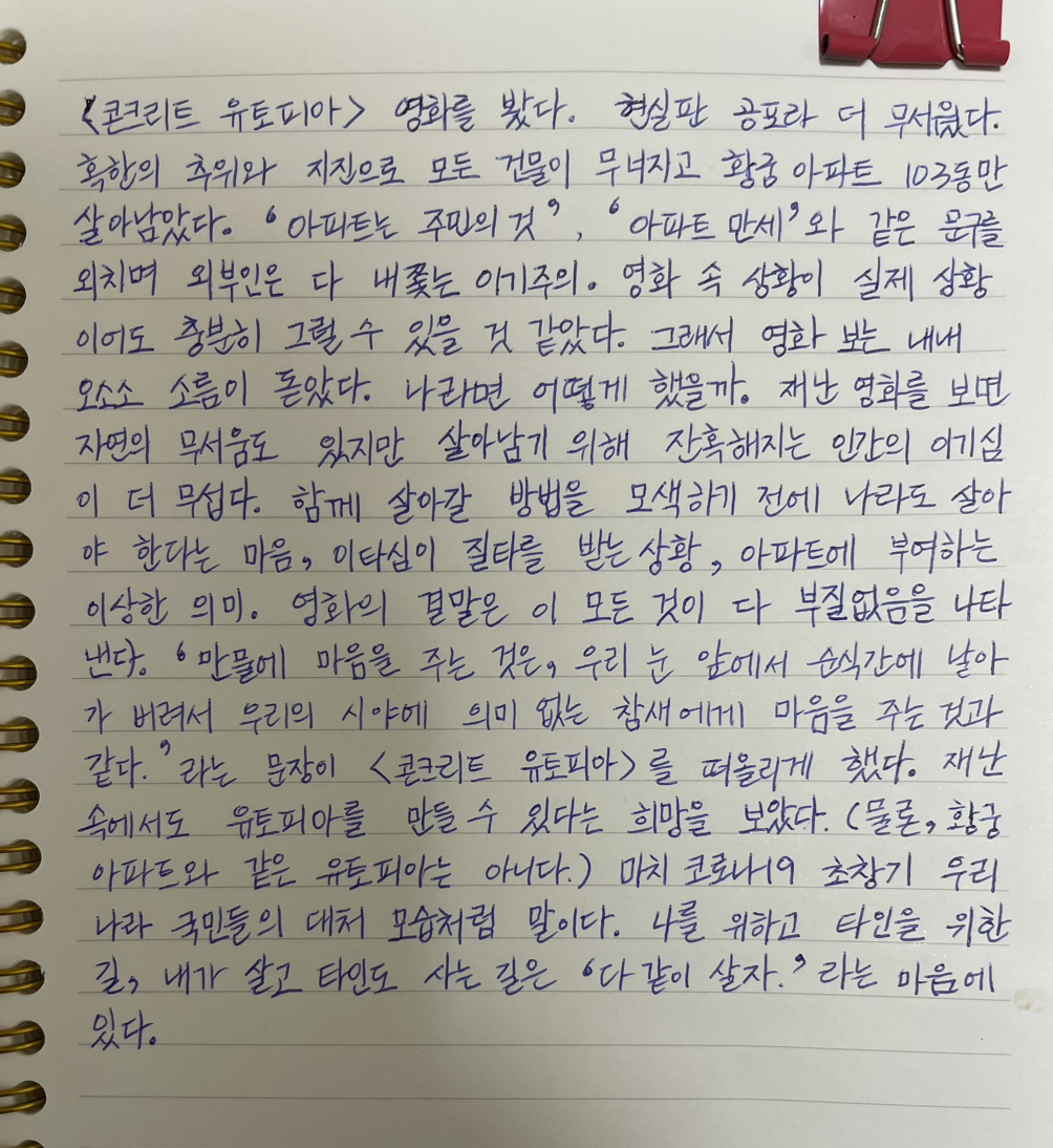 재난 속에서도 유토피아를 만들 수 있다는 희망을 보았다. (물론, 황궁 아파트와 같은 유토피아는 아니다.)