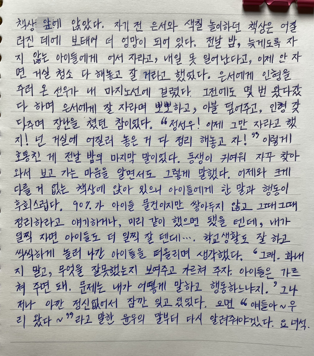 어제와 크게 다를 거 없는 책상에 앉아 있으니 아이들에게 한 말과 행동이 후회스럽다.