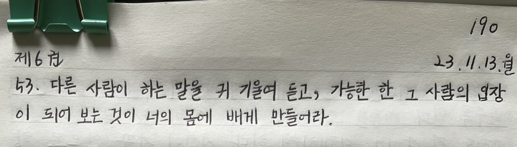‘다른 사람이 하는 말을 귀 기울여 듣고, 가능한 한 그 사람의 입장이 되어 보는 것이 너의 몸에 배게 만들어라.’ 이 한 줄이 바로 어제의 내게 하는 말 같다.
