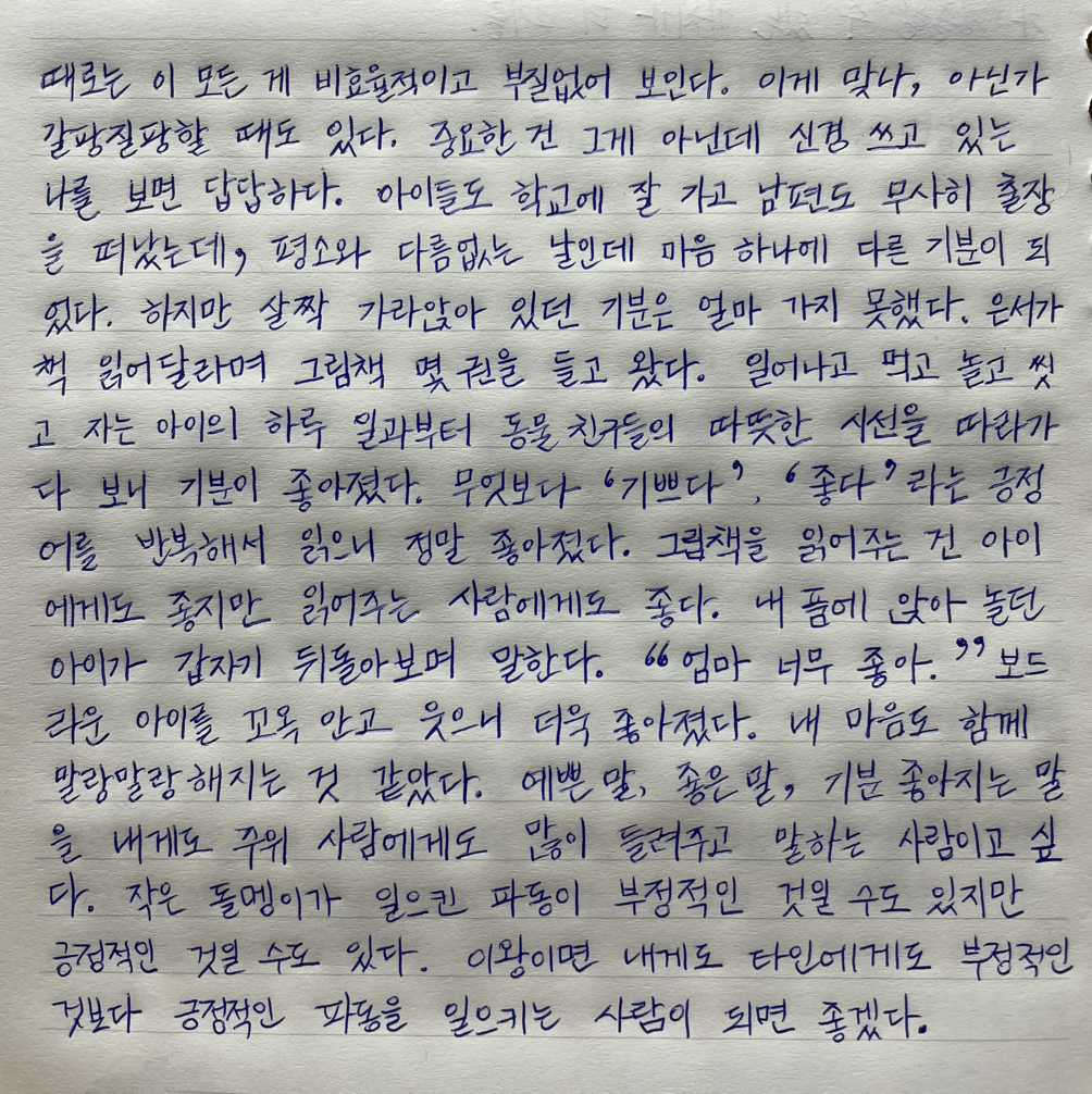 이왕이면 내게도 타인에게도 부정적인 것보다 긍정적인 파동을 일으키는 사람이 되면 좋겠다.